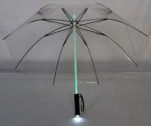 Tal que la espada laser de color a elegir pero protegiendo de la lluvia y con una linterna LED en la empuñadura para seguridad al anochecer.